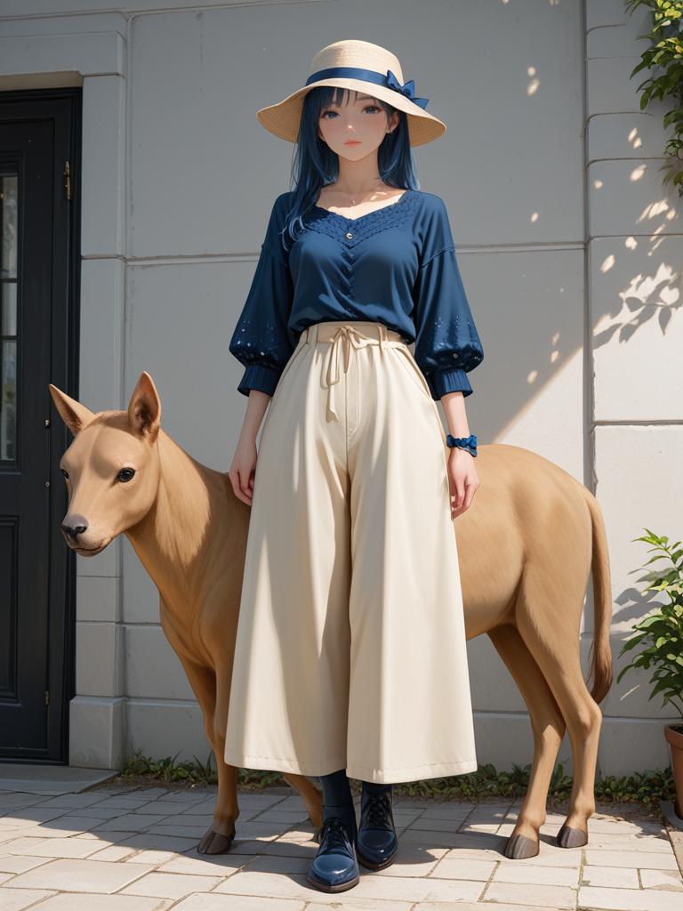 1girl, realistic face, full body shot, Woman, casual, navy blue marled knit top, three-quarter sleeves, round neckline, slim-fit taupe pants, wide-brimmed felt hat in camel color, chunky wrist accessory.