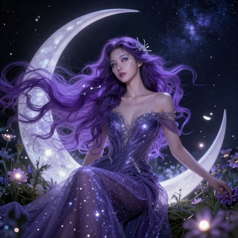 Digital fantasy artwork of a purple-haired woman in a sparkly, off-shoulder gown, sitting under a glowing crescent moon, surrounded by stars