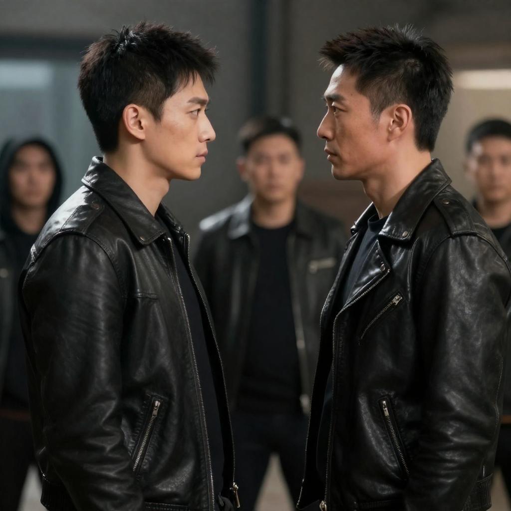 Two men in black, wet, leather jackets facing each other, crouched, fists raised, intense expressions, raining, dusty ground, white cloth-covered background, evening light, gritty atmosphere.