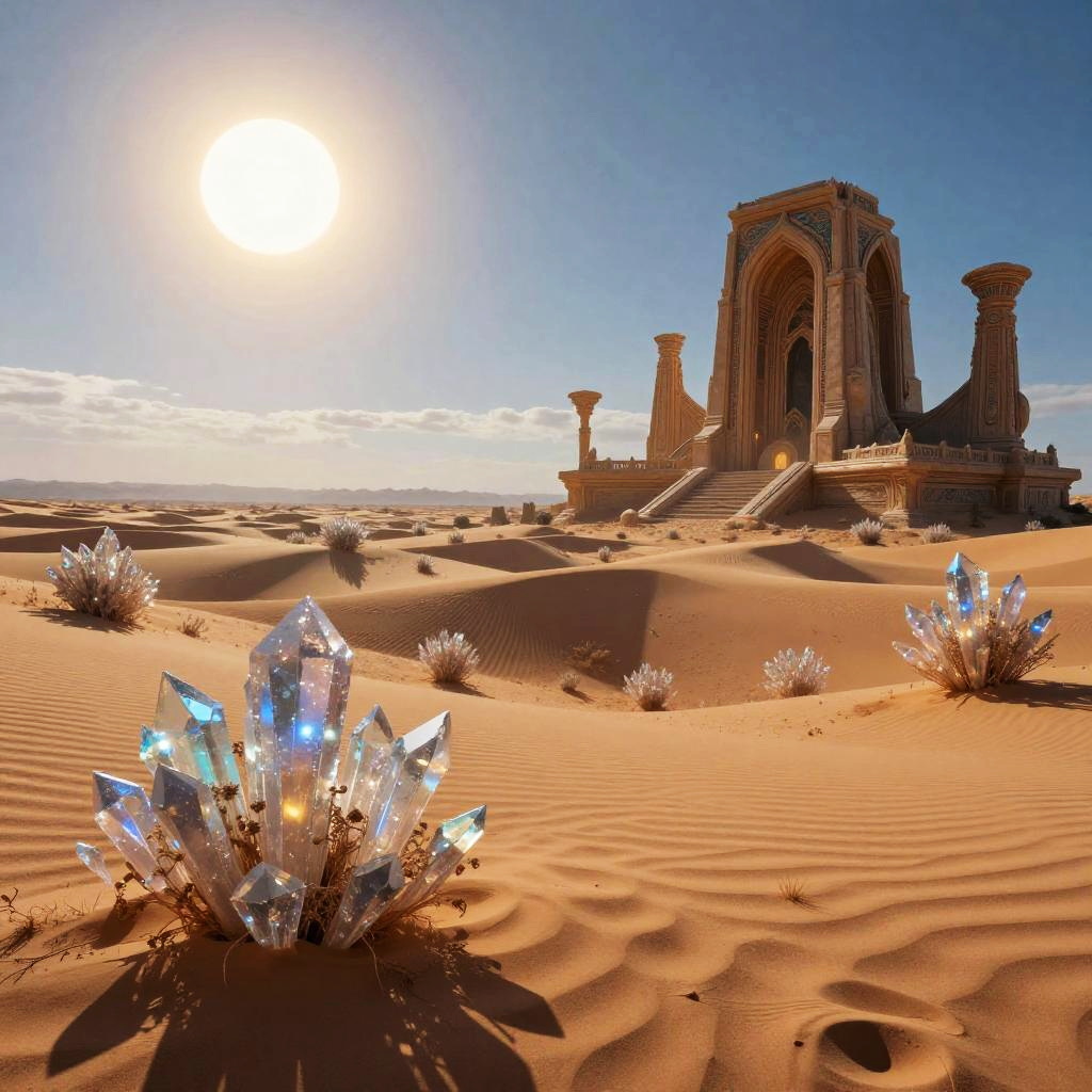 A photograph of a sunlit, desert landscape with golden sand dunes. In the foreground, glowing, blue and white crystal-like structures emerge from the sand. In the background, a grand, ancient-looking stone structure with tall, ornate columns rises against a clear, blue sky. The sun is bright and high, casting long shadows across the scene. The texture of the sand is rippled, and the crystals reflect sunlight, adding a magical, otherworldly element to the arid environment.