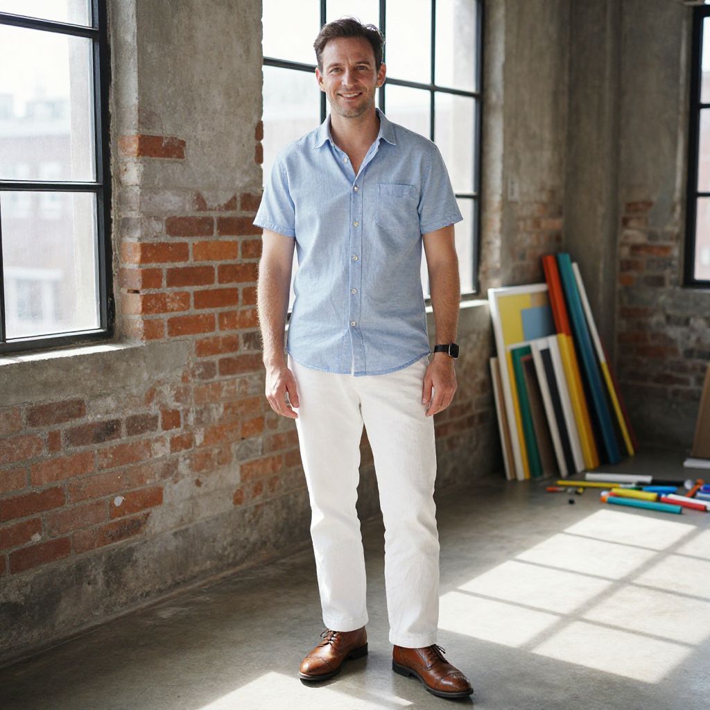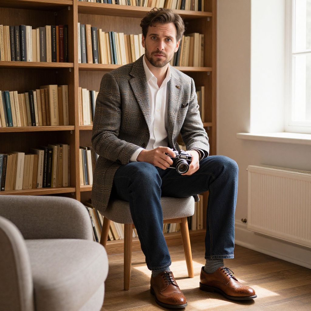 A man, heritage denim shirt in deep indigo, beige chinos, brown leather loafers, rustic brick walls, shelves lined with handmade pottery, cozy seating areas with vibrant cushions, Holga camera style, warm and nostalgic tones, relaxed smile, inviting expression. Man has masculine face and piercing eyes