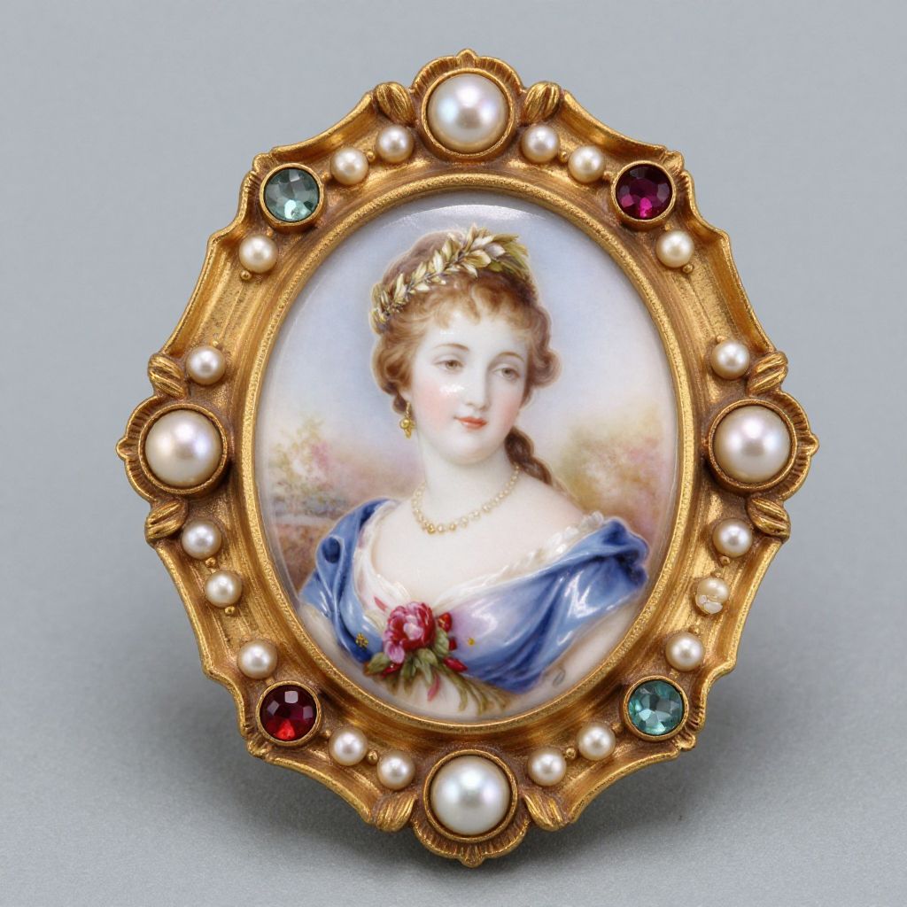 Photograph of an intricately detailed, oval, gold brooch with pearls and gemstones, featuring a painted portrait of a young woman in a blue