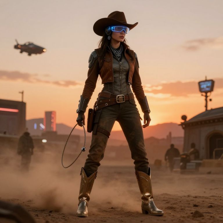 Portrait of a futuristic cowgirl in a dusty cyberpunk frontier, blending traditional cowgirl attire with advanced technology like augmented reality glasses, digital lassos, and metallic boots, set against a sunset skyline with flying vehicles and neon signs.