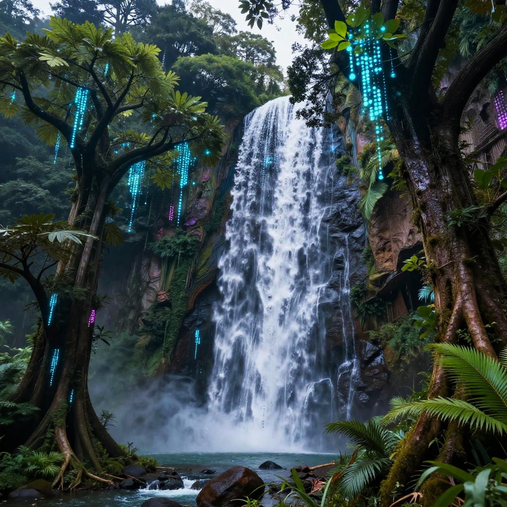Imagef surreal landscape blending nature and technology, massive trees with glowing digital leaves, waterfalls made of flowing pixels, vivid colors, dreamlike atmosphere, fantasy art style