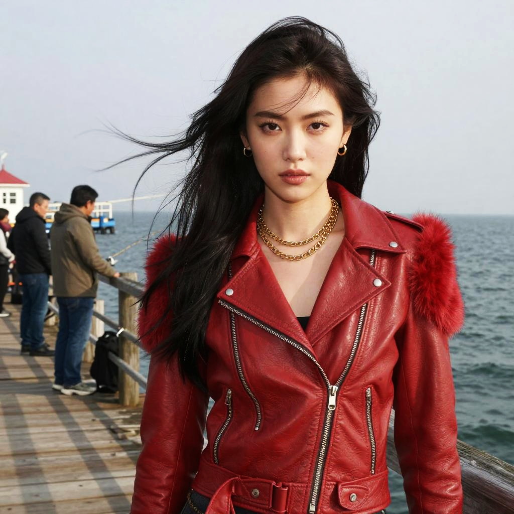 A willowy woman in an edgy chic red leather biker jacket with fur sleeves and an asymmetrical zipper stands confidently at a fishing pier with tourists, her layered gold necklaces catching the light. The scene is infused with a vertical ink visual style, capturing her hair blowing in the breeze against the vibrant backdrop of the water and bustling activity around her. Sexy. Pretty face and beutiful eyes