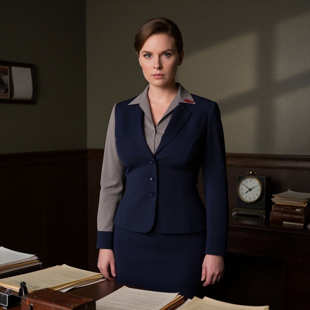 A stern Cold war agent woman in her late 30s with sharp cheekbones, piercing grey eyes, and a calm, serious expression stands in a dimly lit, vintage office basement, surrounded by old documents, leather-bound files, and a broken clock. She wears a tailored navy-blue suit with structured muted tones—taupe, charcoal, and soft grey—accentuating her poised and covert demeanor. The scene radiates secrecy and tension, with shadows playing across the walls and a single flickering lamp casting deep shadows, emphasizing her hidden role as a secret operative.. The woman has big tits and cute face