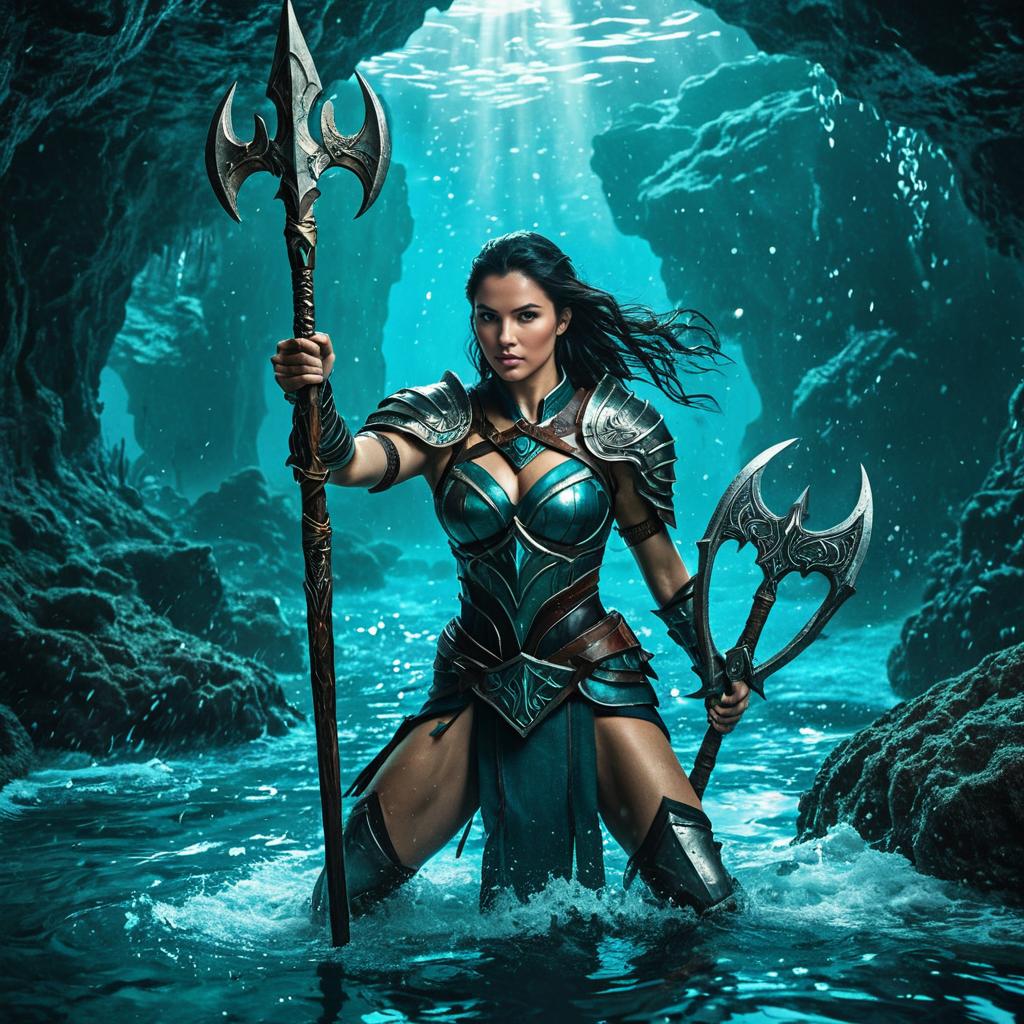 A fantasy warrior woman with dark hair, wearing intricately detailed armor, wielding a trident staff, manipulating dynamic water magic around her in a mystical underwater cave, dramatic lighting highlighting her determined expression and battle stance, rich blue and teal color tones in the water and background, fantasy digital art style