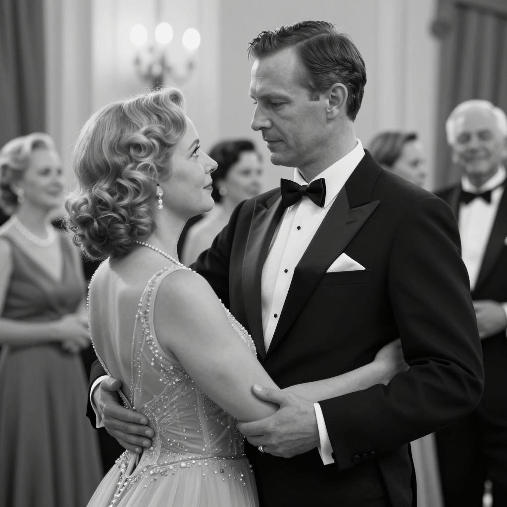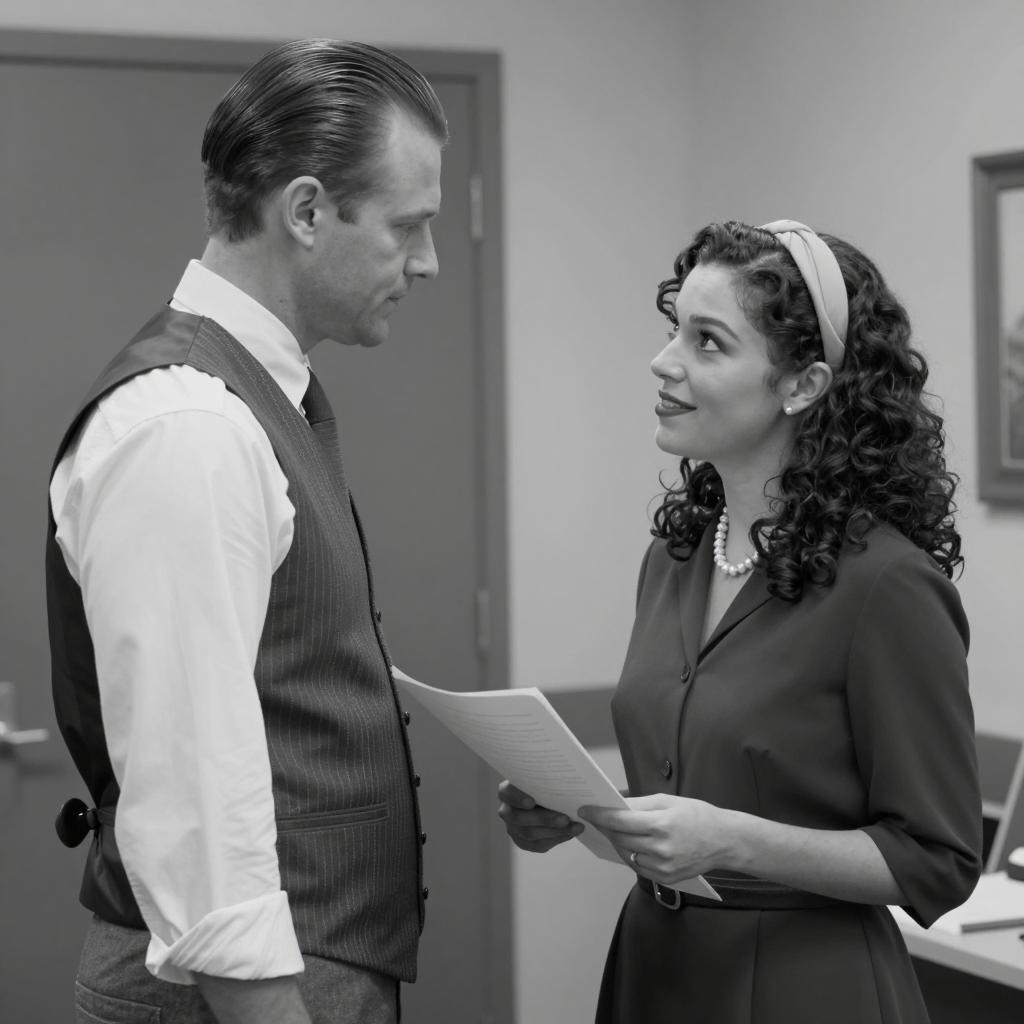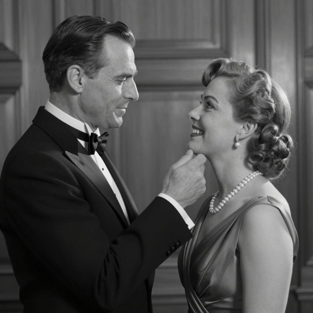 Black and white photo of a man and woman in a dimly lit room celebrating film awards. The man wears a light gray suit, white shirt, black tie, and a black fedora, holding a classic Oscar statuette and speaking on a rotary phone. The woman has dark wavy hair, wearing a dark velvet dress with a fur collar, smiling while holding an open award case. The scene features vintage decor with a large curved window and soft lighting.