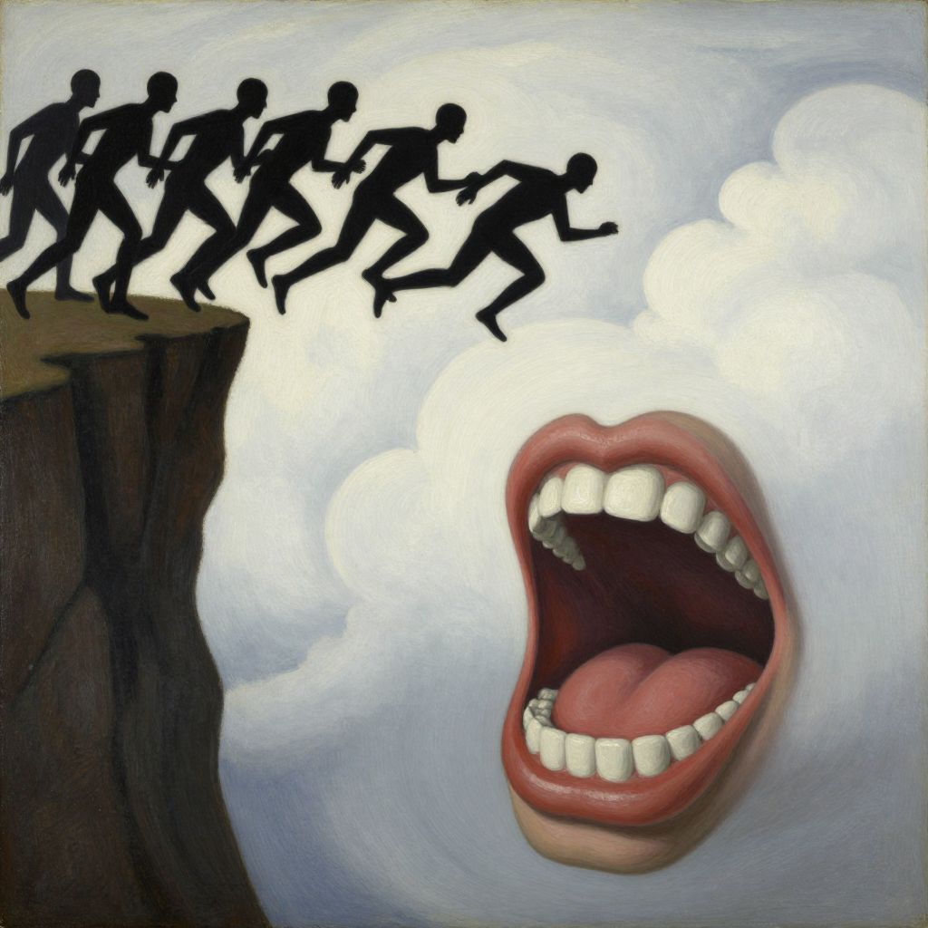 This surreal digital painting features a large, open mouth with red lips and white teeth, set against a backdrop of white, fluffy clouds. The mouth dominates the right side of the image. In the upper left, six black silhouetted figures, resembling athletes, are running towards the mouth from a tall, brown cliff. The figures are in mid-stride, creating a sense of urgency and movement. The contrast between the dark silhouettes and the bright mouth and clouds adds a dramatic effect. The overall style combines realistic textures with surreal, abstract elements, creating a visually striking and thought-provoking scene.