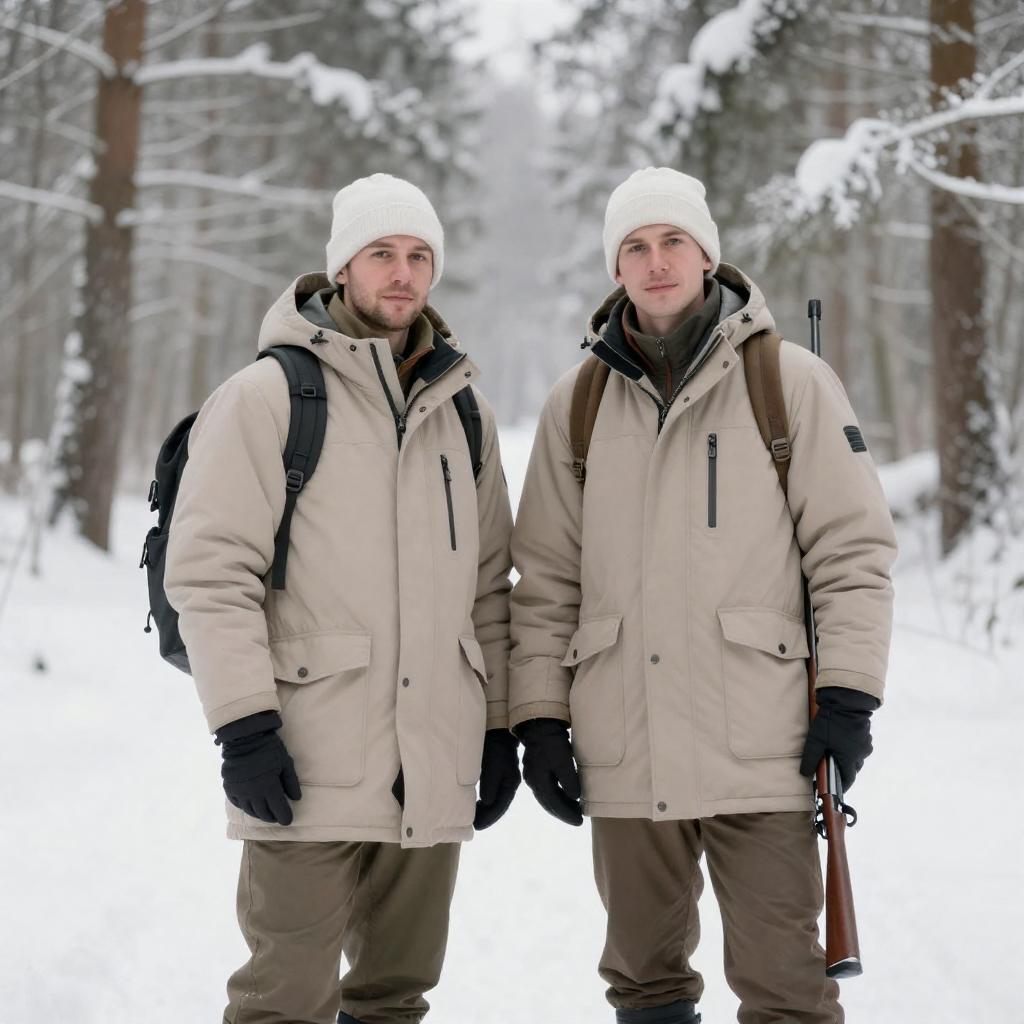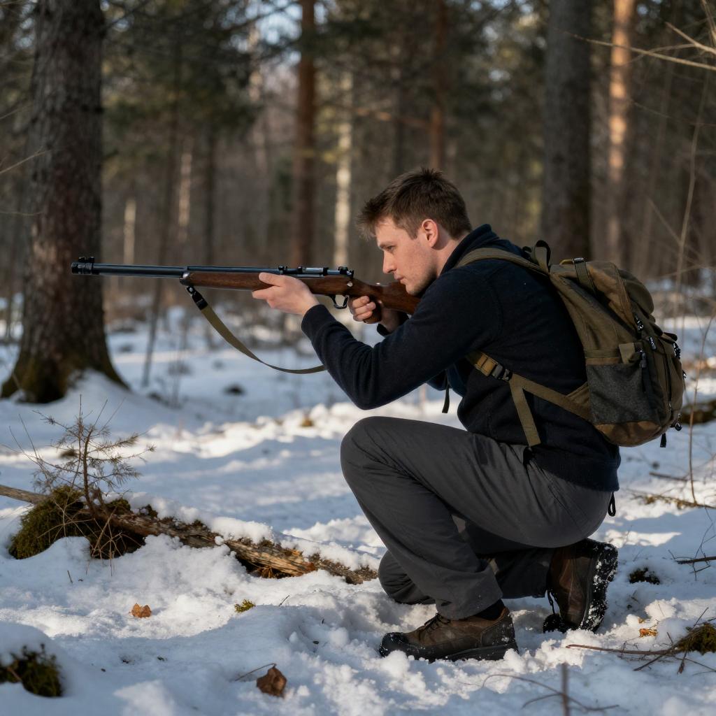 A bearded man in a brown coat and knit hat aims two handguns, one in each hand, at a snowy, tree-filled background. Snow covers the ground and branches, with a blurred, overcast sky above. His focused expression contrasts with the serene winter landscape.
