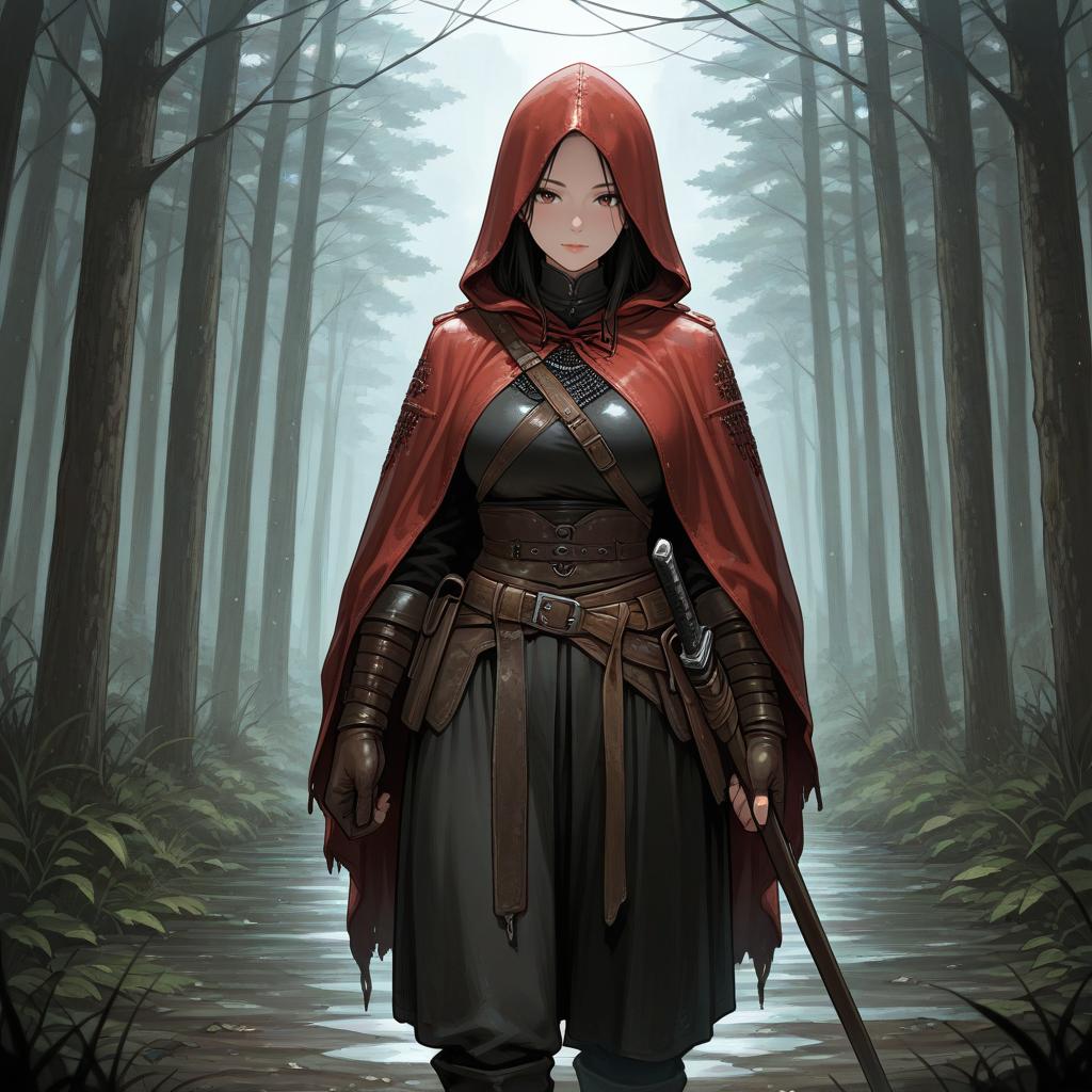 Digital illustration of a strong, confident Asian woman with long, dark brown hair, standing against a white background. She wears a white, flowing kimono-style robe with black armor on her shoulders and arms, and dark pants. A red sash is tied around her waist, and she holds a large, red and white flag with a black emblem in her left hand. Her right hand rests on the hilt of a long, straight sword. She also wears brown boots and a sheathed dagger on her right hip. Her expression is serious and determined. The style is highly detailed and semi-realistic.