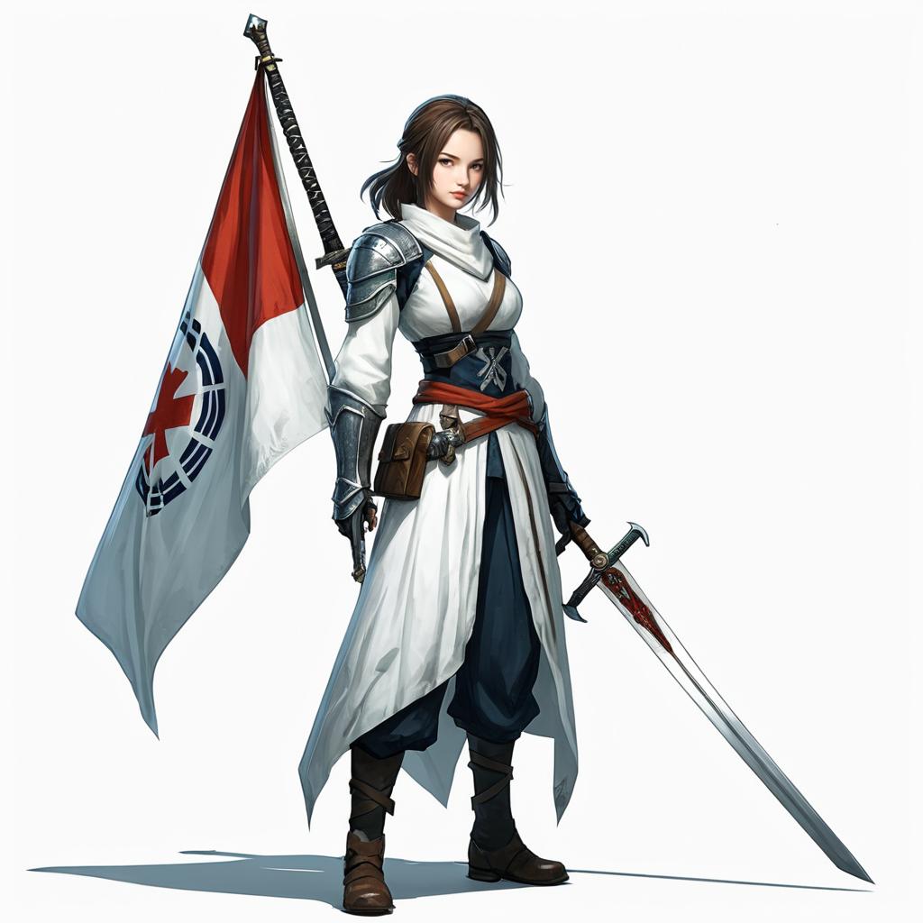 A2nd, 1.1Clothing, 1girl, solo, weapon, sword, full body, white background, flag, holding, simple background, looking at viewer, banner