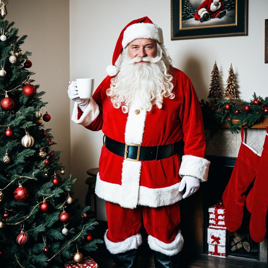 Funny Santa Standing with Coffee