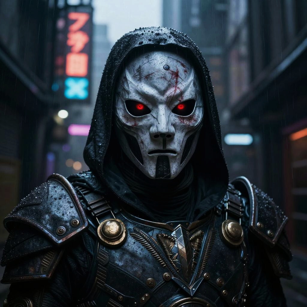 Doom without mask, emerging from shadows in a dark alley of a neon-lit cyberpunk city, face serious with subtle scars and intensity, mix of ancient and futuristic armor, glowing red eyes, rain-soaked environment, detailed and atmospheric, high-tech and dark fantasy fusion.
