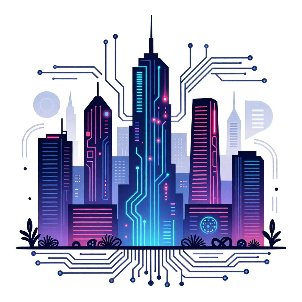 AI inspired art depicting a futuristic cityscape with neon lights and abstract geometric patterns, blending organic and technological elements, rendered in vibrant colors with a surreal, digital painting style.