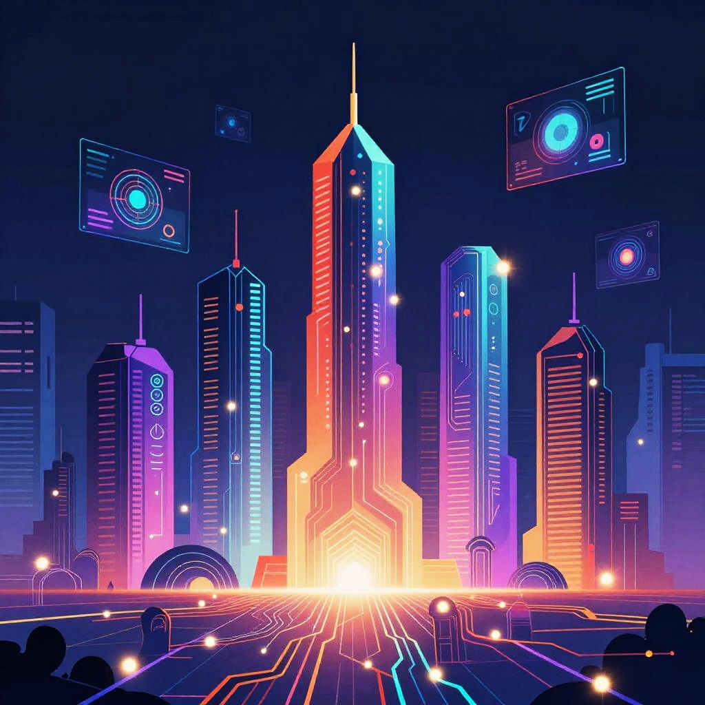 Neon-lit, futuristic cityscape digital artwork featuring vibrant purple, blue, and orange lights on towering skyscrapers, with glowing traffic lights and