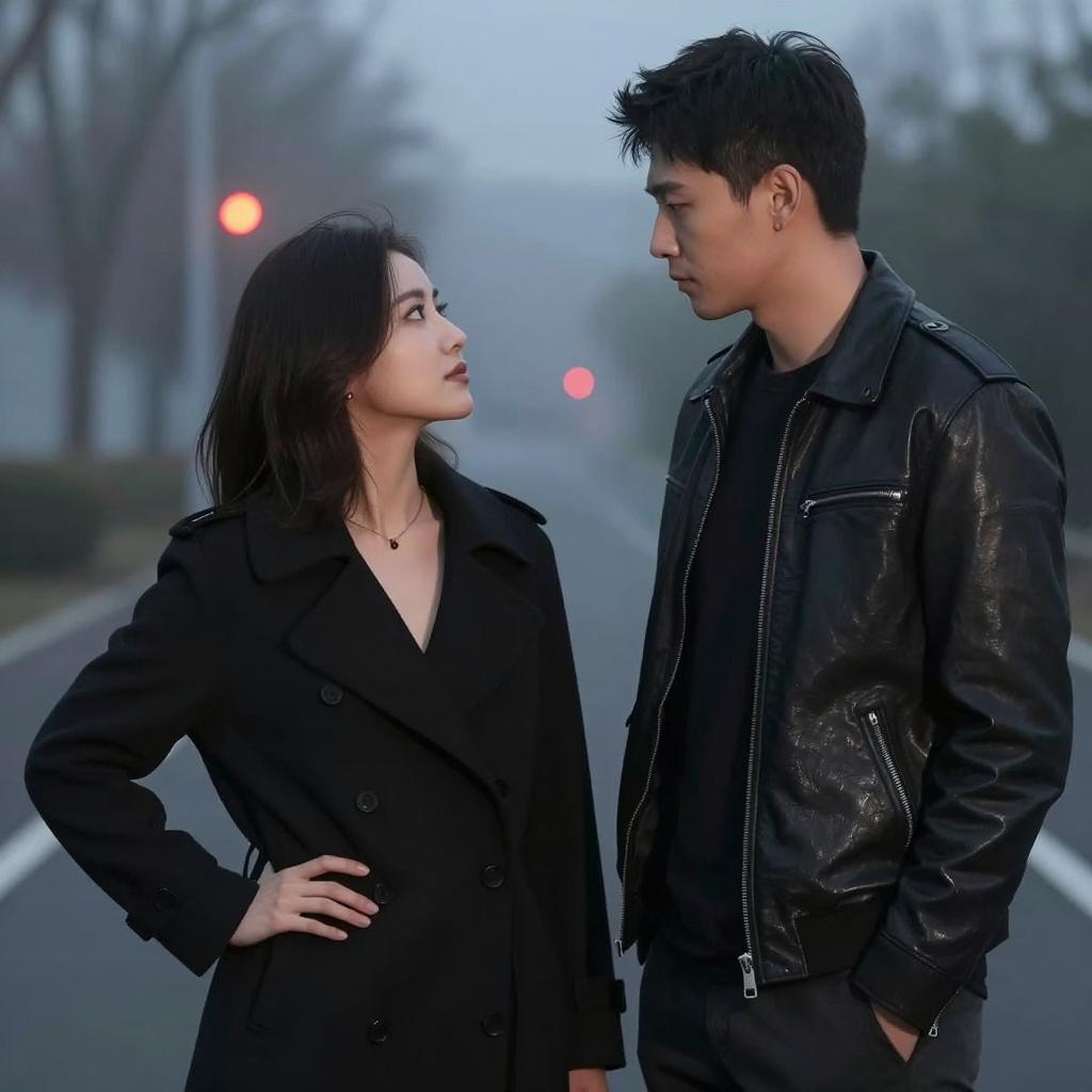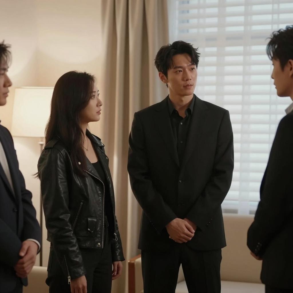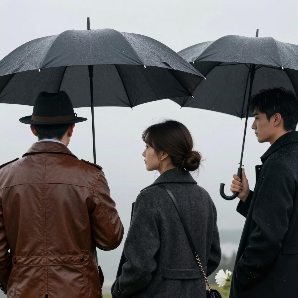 Three people holding black umbrellas in rain. Man in brown leather coat and hat on left, woman in dark coat in center, man in dark coat on right. Water droplets on umbrellas. Overcast background. Woman faces right, men face away. Woman's hair in bun. Man on right holds white flower. Umbrellas partially open.