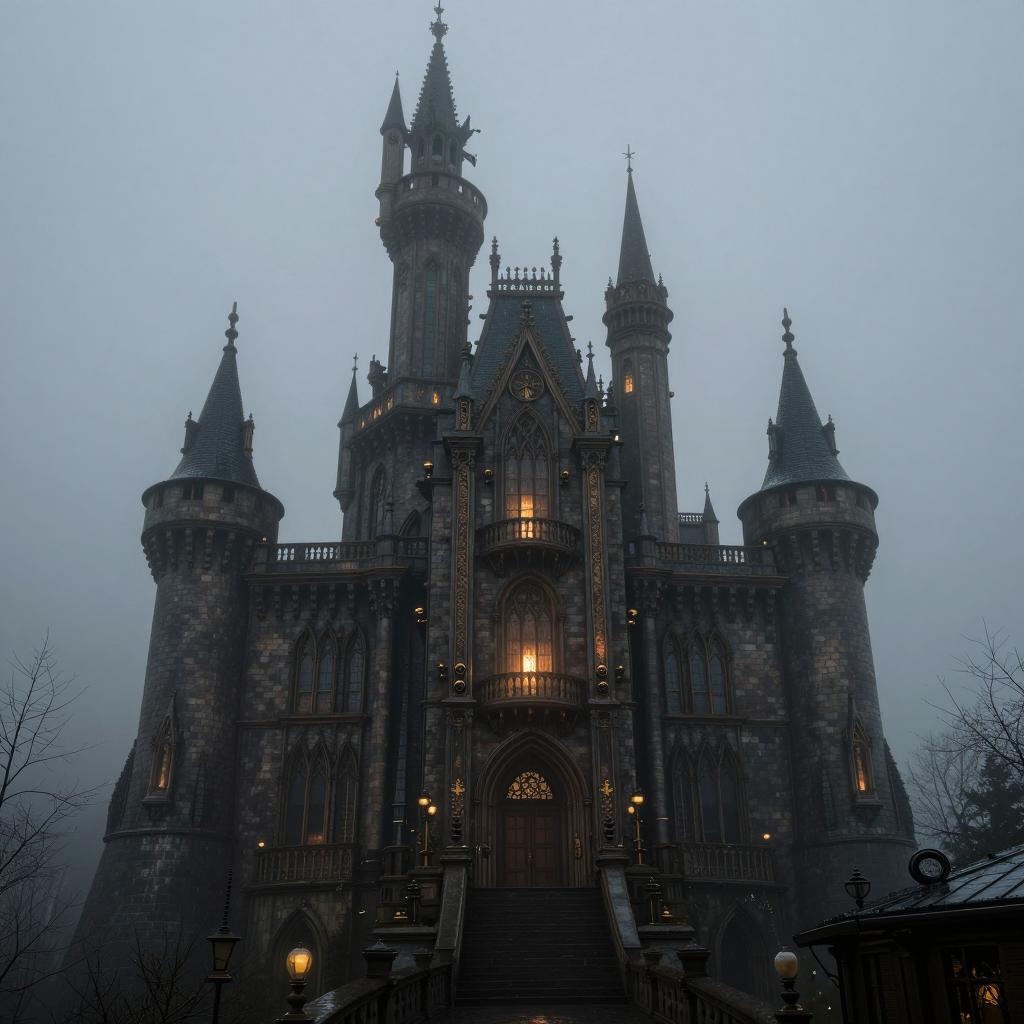 Dark steampunk-style castle with multiple tall, pointed towers and intricate detailing, surrounded by a misty, foggy atmosphere at dawn. The scene features subtle lighting inside the castle, drizzling rain, and barren trees, creating a mysterious and moody ambiance.