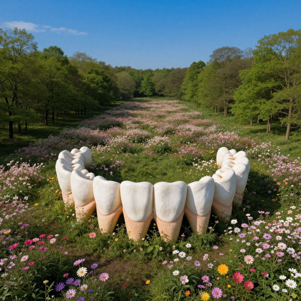 A dreamy landscape evokes Magritte's surrealist essence, with a verdant forest floor stretching towards a vivid blue sky. Emerging from the ground, a field of blossoming flora mimics human teeth, their petals unfurling like fangs or molars, creating an eerie yet alluring tapestry. Observed from above, this aerial perspective emphasizes both the surreal juxtaposition and tranquility, inspiring wonder and contemplation in viewers as they explore the whimsical, enchanting scene.