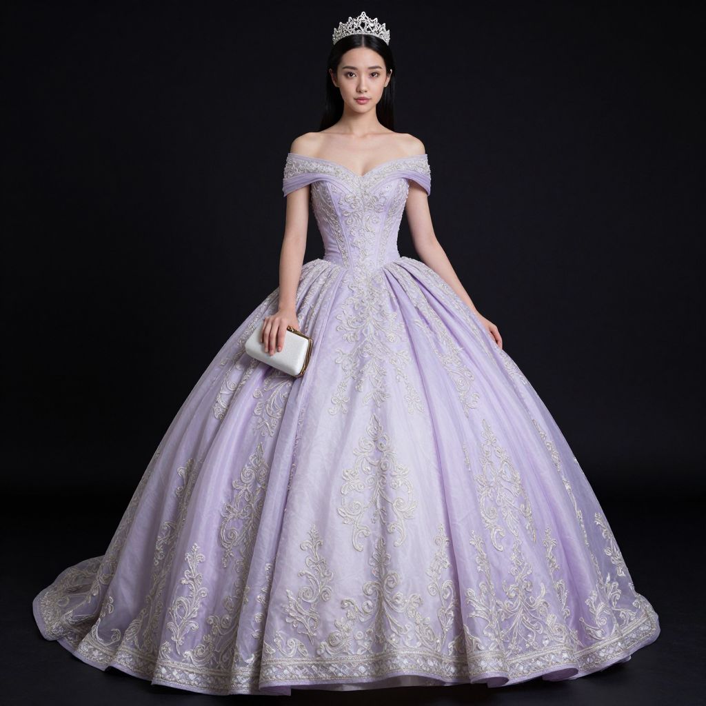 Photograph of a beautiful woman standing against a black background, wearing an off-the-shoulder, lavender ball gown with intricate silver embroidery and a full, voluminous skirt. She has long black hair, a silver tiara, and a calm expression. She holds a small white clutch in her right hand. The gown's light purple color and delicate patterns give it a royal, fairy-tale vibe.