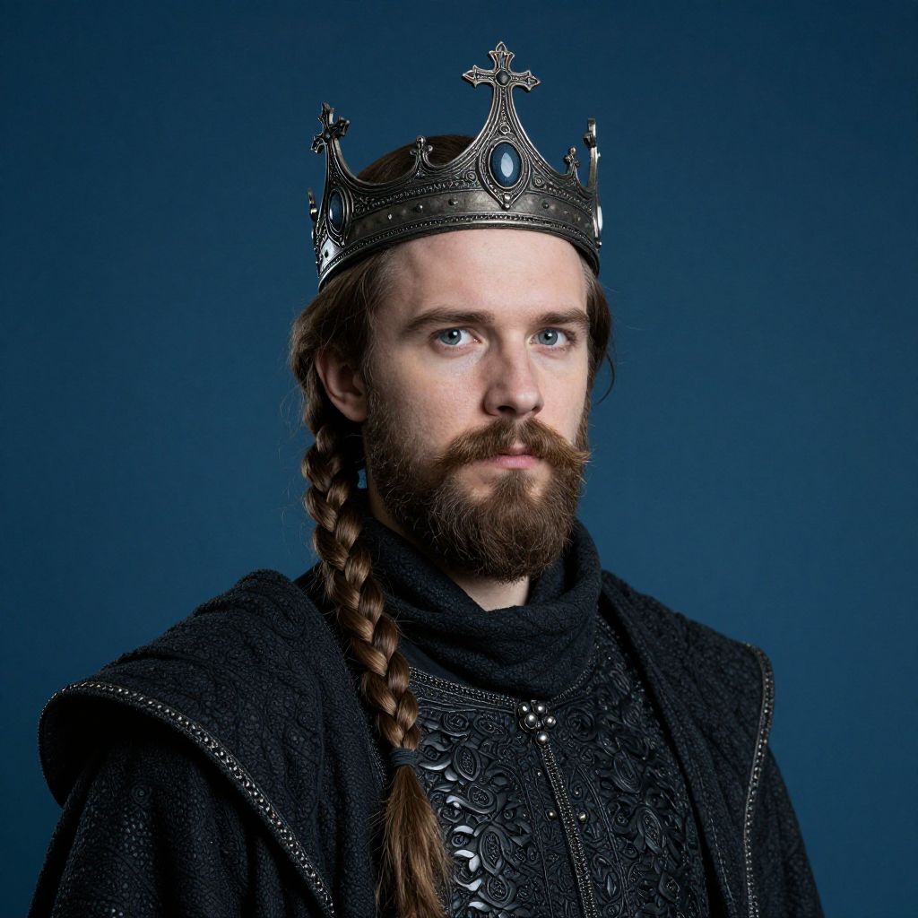 Dark northern king costume, 1boy, male focus, crown, solo, facial hair, mustache, beard, braid, scarf, upper body, blue background
