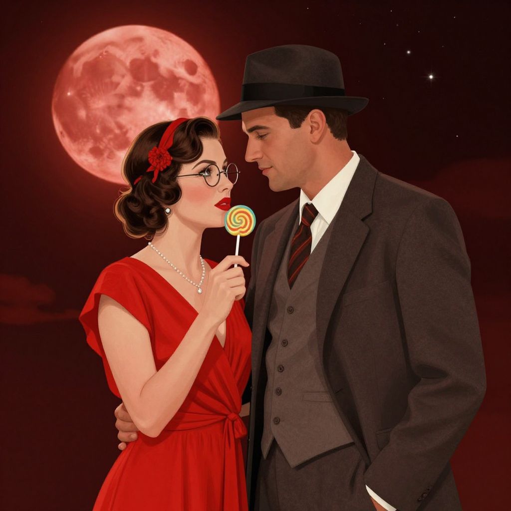 A vintage-inspired digital illustration set against a dramatic backdrop of a red moon and starry sky, featuring a couple in 1920s attire—a woman in a red dress and glasses holding a lollipop, and a man in a suit and fedora—capturing a romantic moment with a retro, cinematic aesthetic.
