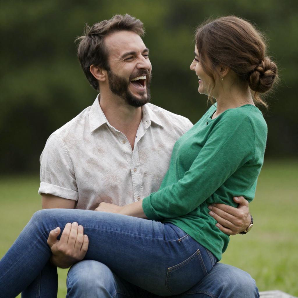 Photograph of a man and woman outdoors. Man with dark hair, beard, white shirt with brown patterns, blue jeans, laughing with mouth open. Woman with brown hair in bun, green long-sleeve shirt, sitting on his lap, smiling. Man holding her waist and thighs. Background of green trees and grass. Bright daylight.