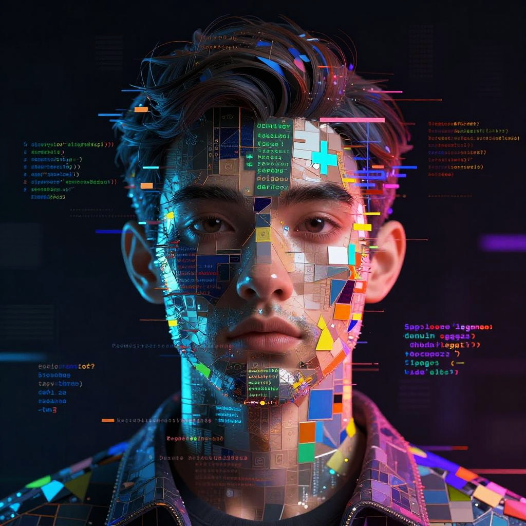 AI your photo concept: a digital avatar emerging from a photo frame, pixels turning into AI neural networks, surreal fusion of photography and artificial intelligence elements, soft light contrasts, ultra-modern aesthetics, photorealistic with abstract AI symbols swirling around