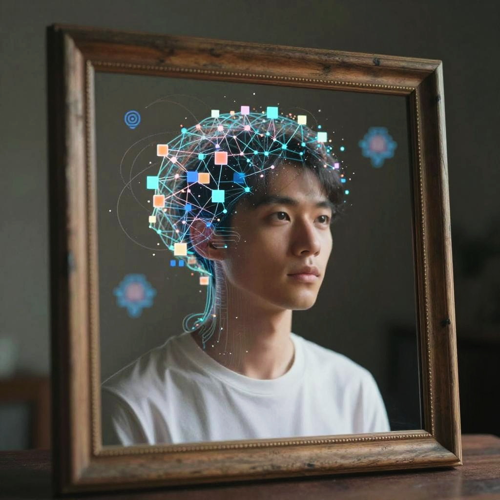 Photograph of an Asian man with short black hair, wearing a white t-shirt, reflected in a wooden-framed mirror. His reflection is digitally altered with a network of colorful, glowing squares and lines, resembling a neural network or digital interface. The background is dark and blurred, emphasizing the man's calm, focused expression. The image combines realistic photography with digital art elements, creating a futuristic, tech-inspired portrait. The mirror is centered in the foreground, with the man's face slightly off-center to the right.