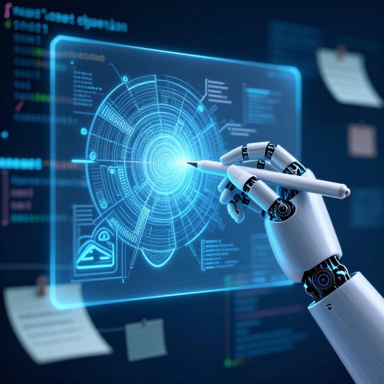 Graphic design AI free innovation depicted by a glowing robotic hand holding a stylus, drawing intricate designs on a transparent screen, set against a background of code snippets and creative brainstorming notes.