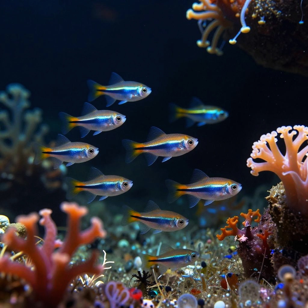 A school of quastenflosser navigating through an underwater cave system, vibrant bioluminescent fungi and plants lighting their path, with a mystical and somewhat eerie ambiance, rendered in rich colors and fine detail.