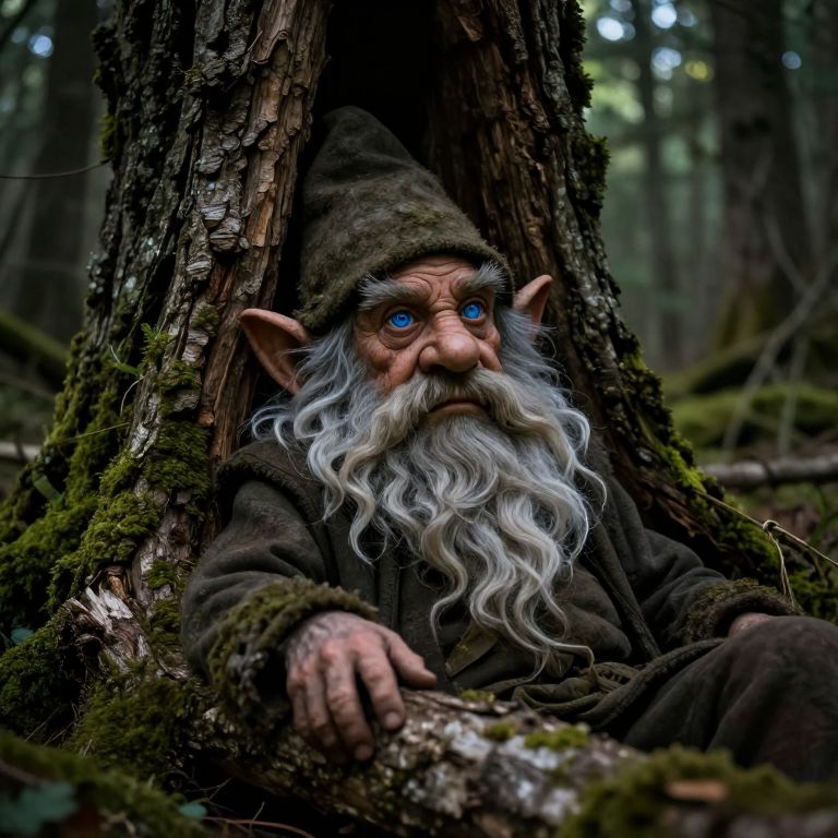 In this captivating portrait, an old gnome with piercing hypnotic eyes emerges from the shadows, resting against a fallen tree in a dense forest. His long, gray beard frames his face, adding to his wise and weathered appearance. The gnome's eyes, a striking shade of blue, gaze directly into the viewer's soul, creating an intense and almost otherworldly connection. The tree, with its rough, textured bark and mossy growth, serves as a natural throne for the gnome, blending seamlessly with the forest's earthy tones. The overall composition is masterful, with the gnome positioned centrally, his gaze slightly off to the side, as if lost in thought or observing the viewer. The interplay of light and shadow enhances the mystical atmosphere, highlighting the gnome's detailed features and the intricate textures of the surrounding forest.