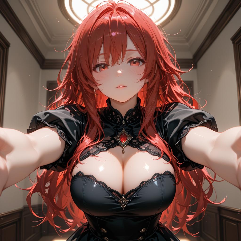 Digital artwork of a red-haired anime girl with long, messy hair and red eyes, wearing a black dress with a cleavage cutout and puffy short sleeves. The character is depicted indoors with a soft light overhead, reaching forward as if giving an incoming hug, showing a close-up upper body view with parted lips and a neutral expression.