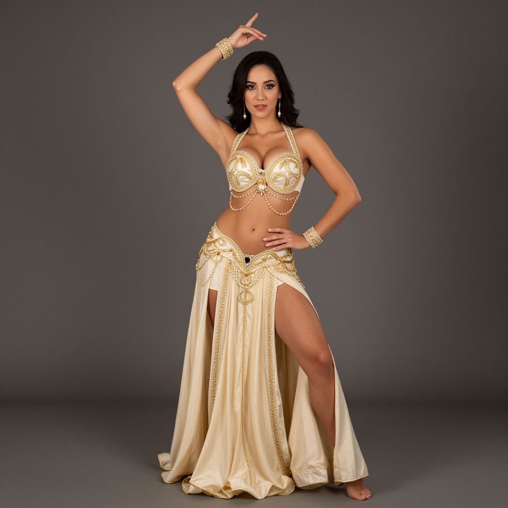 Photograph of a confident woman with long black hair, tan skin, and a curvy physique, posing against a plain grey background. She is wearing an elaborate, golden, belly dancer costume with intricate embroidery, featuring a halter top that accentuates her large breasts, and a flowing skirt with a high slit on her right leg. She has gold bracelets on both wrists and is standing with her right arm raised, pointing upwards, and her left hand on her hip. Her makeup is bold, with dark eyeliner and red lipstick. The costume's fabric is silky and cream-colored, adding a luxurious texture to the image.