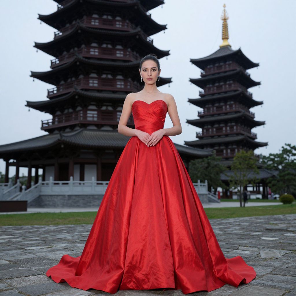 Red Fancy Gown Costume, woman in a red dress standing in front of a pagoda