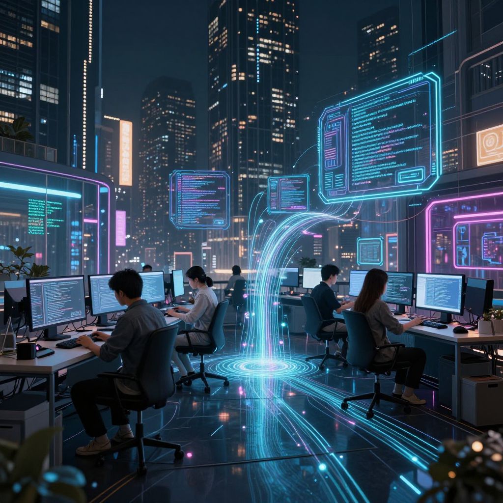 A high-tech digital artist studio set in a futuristic cyberpunk city at night. The scene features diverse human creators working on computers surrounded by neon reflections and luminous streams of AI algorithms visualized as flowing code. The environment blends human creativity with artificial intelligence, highlighted by cinematic lighting and detailed cityscape views through glass walls.