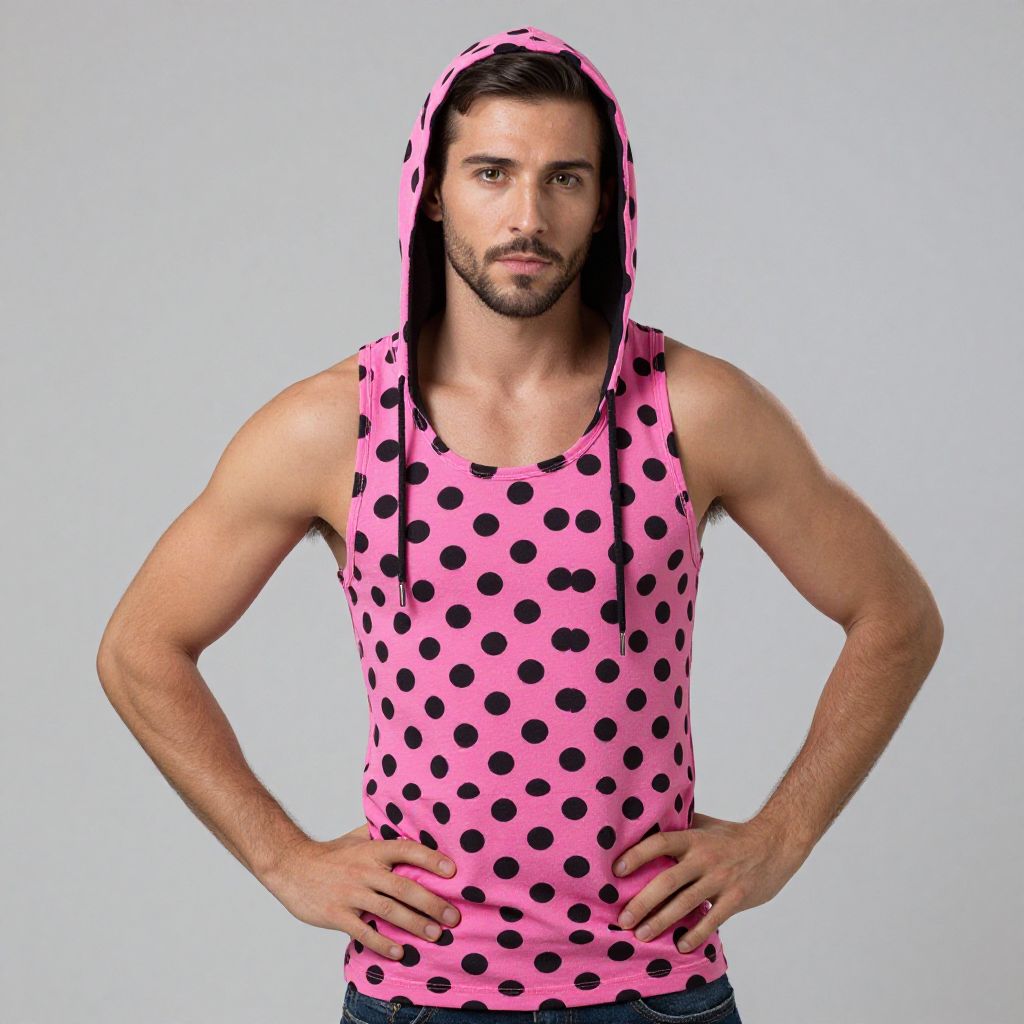 Man wearing a pink and black polka dot tank top with a hoodie on his head. He is standing with his hands on his hips and looking at the camera.