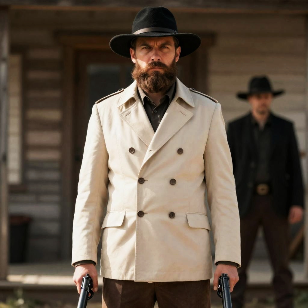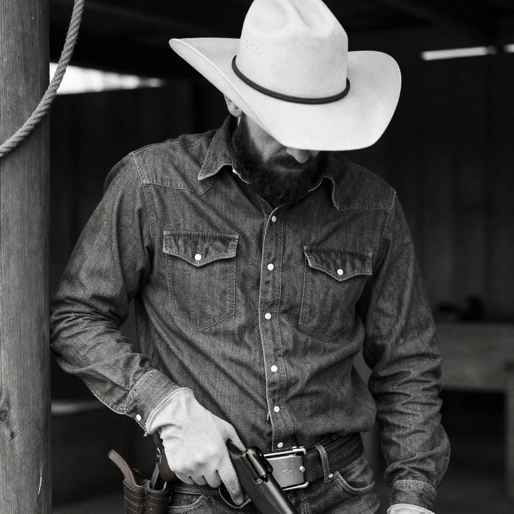 Black-and-white photograph of a bearded man wearing a cowboy hat, denim shirt, and gloves, standing near a wooden structure. He holds a firearm in his right hand and has a belt with a holster on his left side. His head is slightly bowed. The background includes a rope and wooden beams. The man's expression is neutral.