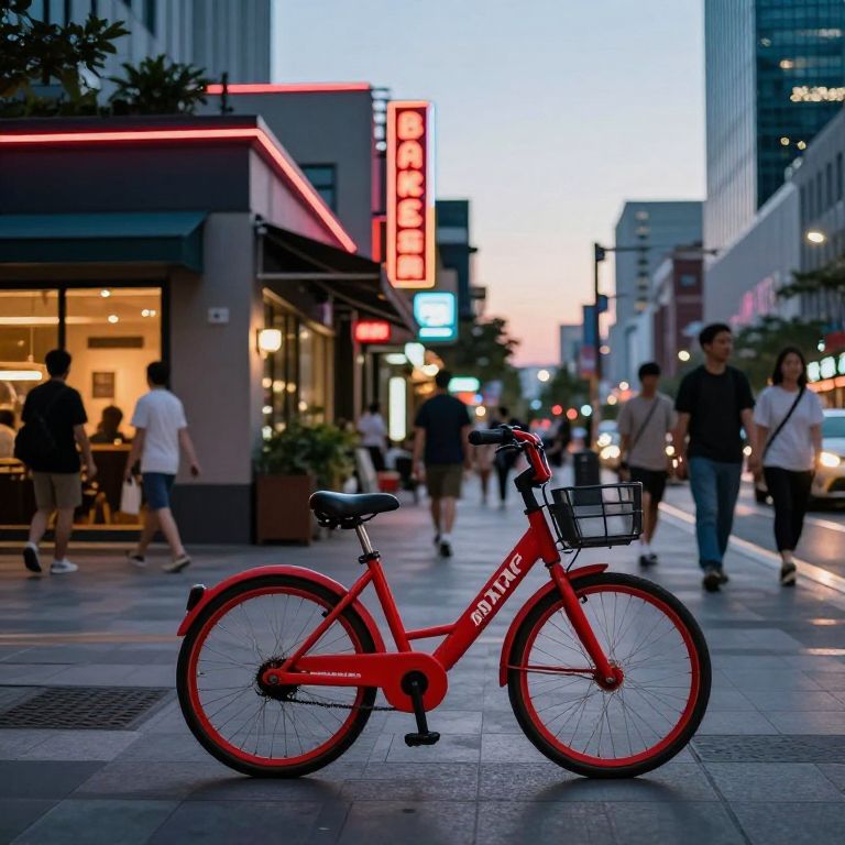 A modern street scene in a city at dusk showing a bicycle with the number 2 painted in bold red on its side, passing by a rooftop with neon signs and a bustling sidewalk filled with people.
