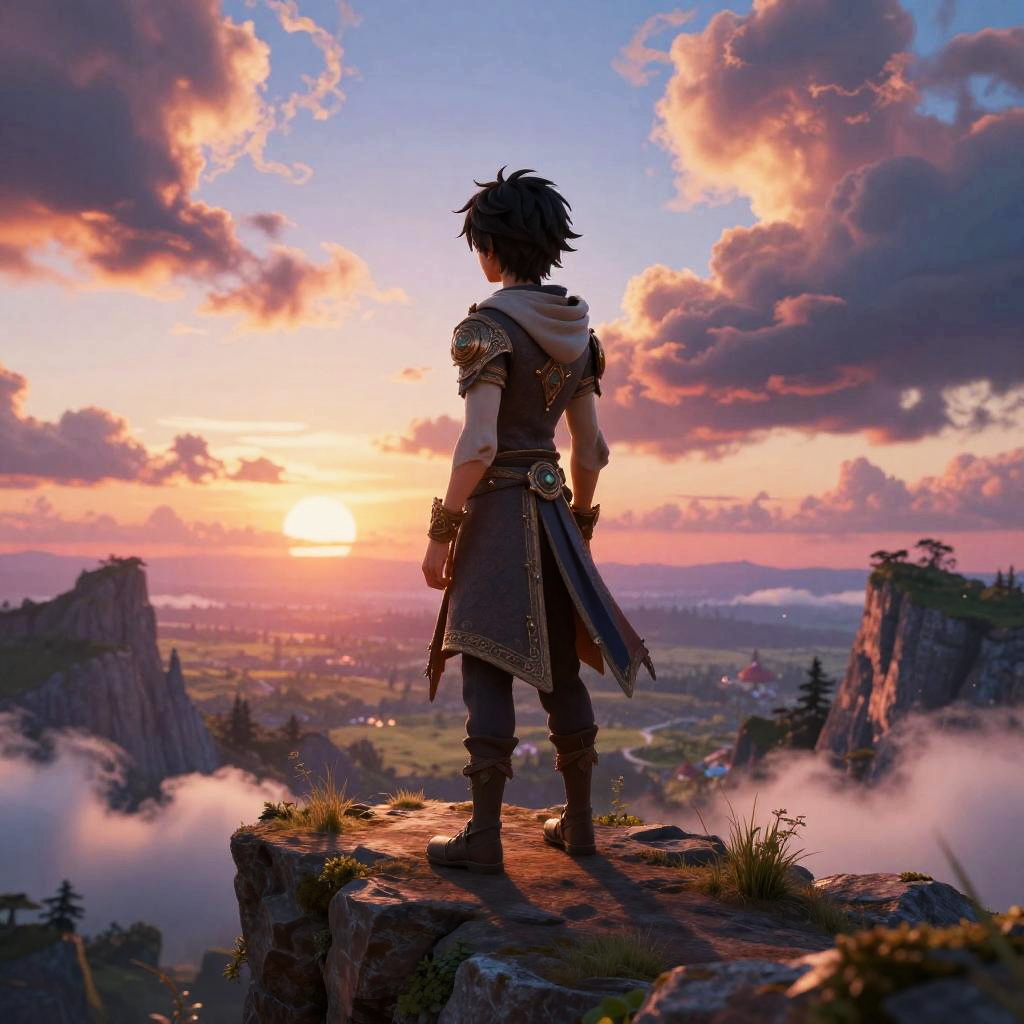 A whimsical character named Suuuu standing on a cliff overlooking a vast fantasy landscape, colorful skies with swirling clouds at sunset, intricate details on clothing and environment, enchanting and surreal mood.