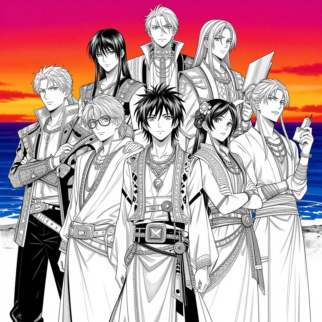 This digital drawing features a group of nine anime-style characters standing together against a vibrant sunset backdrop with a gradient from deep red to orange to yellow, transitioning to blue ocean waves. The characters, with detailed black-and-white line art, include a mix of males and females, each with distinct hairstyles and clothing. They wear traditional Japanese attire with intricate patterns, belts, and sashes. The central character has spiky hair and a focused expression, while others display varied expressions from serious to contemplative. The background's vivid colors contrast with the monochrome characters, emphasizing their detailed line work. The overall style is reminiscent of Japanese manga.