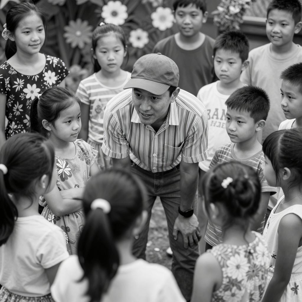 Classroom photograph of six children and one male teacher. Male teacher with white cap, red shirt, and gray underlayer, sits at desk, looking forward. Four children on left, one girl in yellow shirt, one boy in red shirt, two boys in front, one boy in blue shirt. Girl on right wears white shirt, glasses. Shelves with books, potted plants in background. Teacher's hands on desk, children looking at him or away.