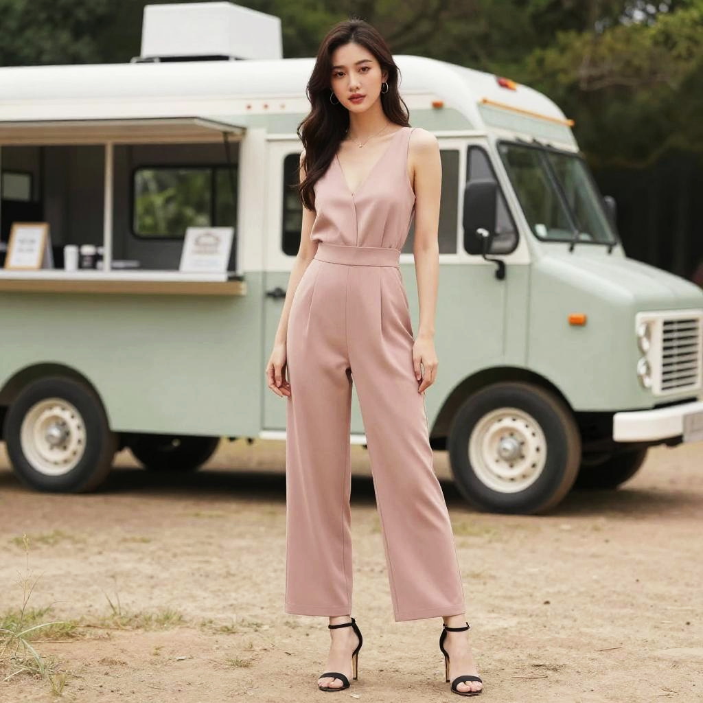 A athletic woman in a minimalist chic dusty rose jumpsuit with a deep v-neckline and wide-leg pants, paired with black open-toe high heel sandals, stands at a Food Truck Rally at the Botanical Gardens, captured in the visual style of hakusensha. Sexy. Pretty face and beutiful eyes