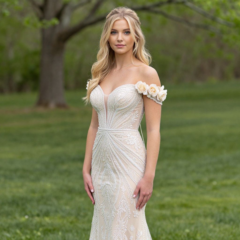 Blonde woman with wavy hair in a white, off-shoulder, lace wedding dress with flower accents, standing in a green grassy park