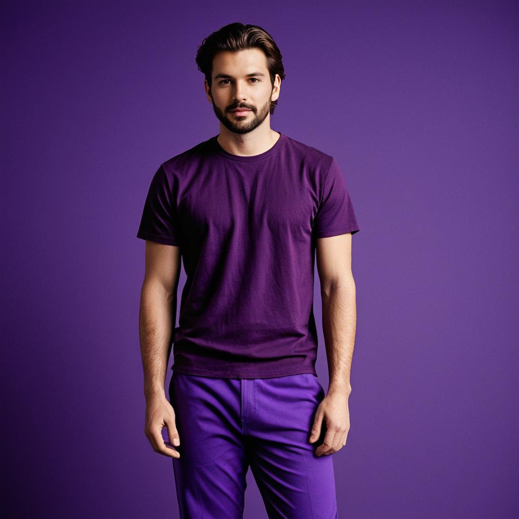 Grey jeans outfit man,1boy, male focus, solo, shirt, pants, realistic, facial hair, brown hair, jeans, denim, grey shirt, t-shirt, beard, grey pants, standing, looking at viewer, grey background