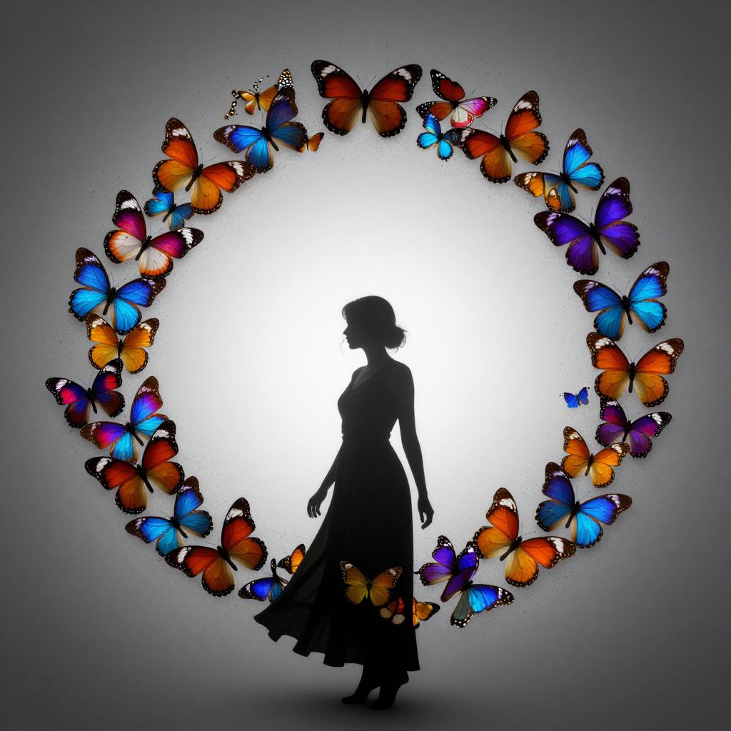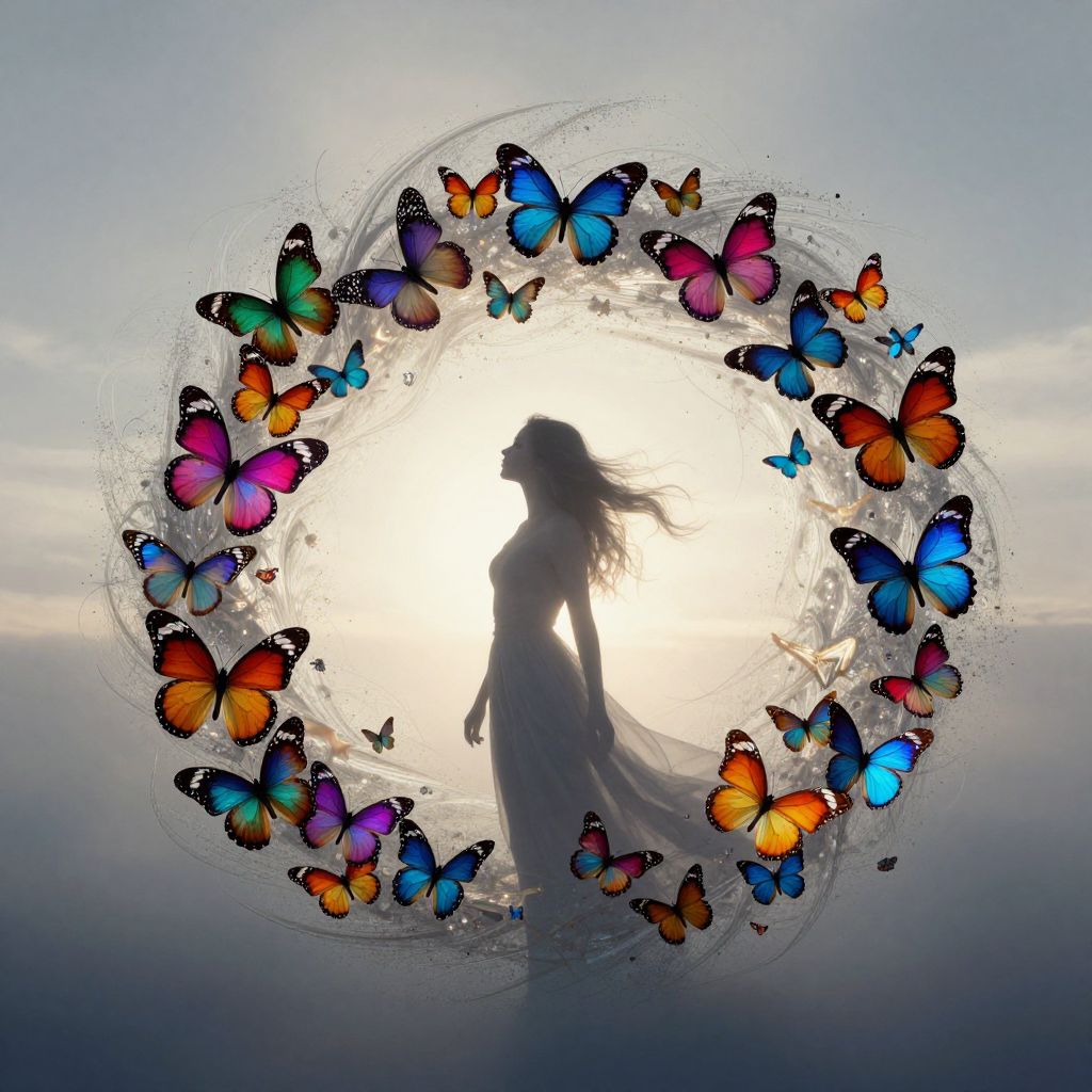 An ethereal silhouette of a woman becomes a vortex of vibrant butterflies, symbolizing the allure of infinite beauty and the delicate balance between freedom and captivity, evoking a poignant blend of serenity and existential longing.