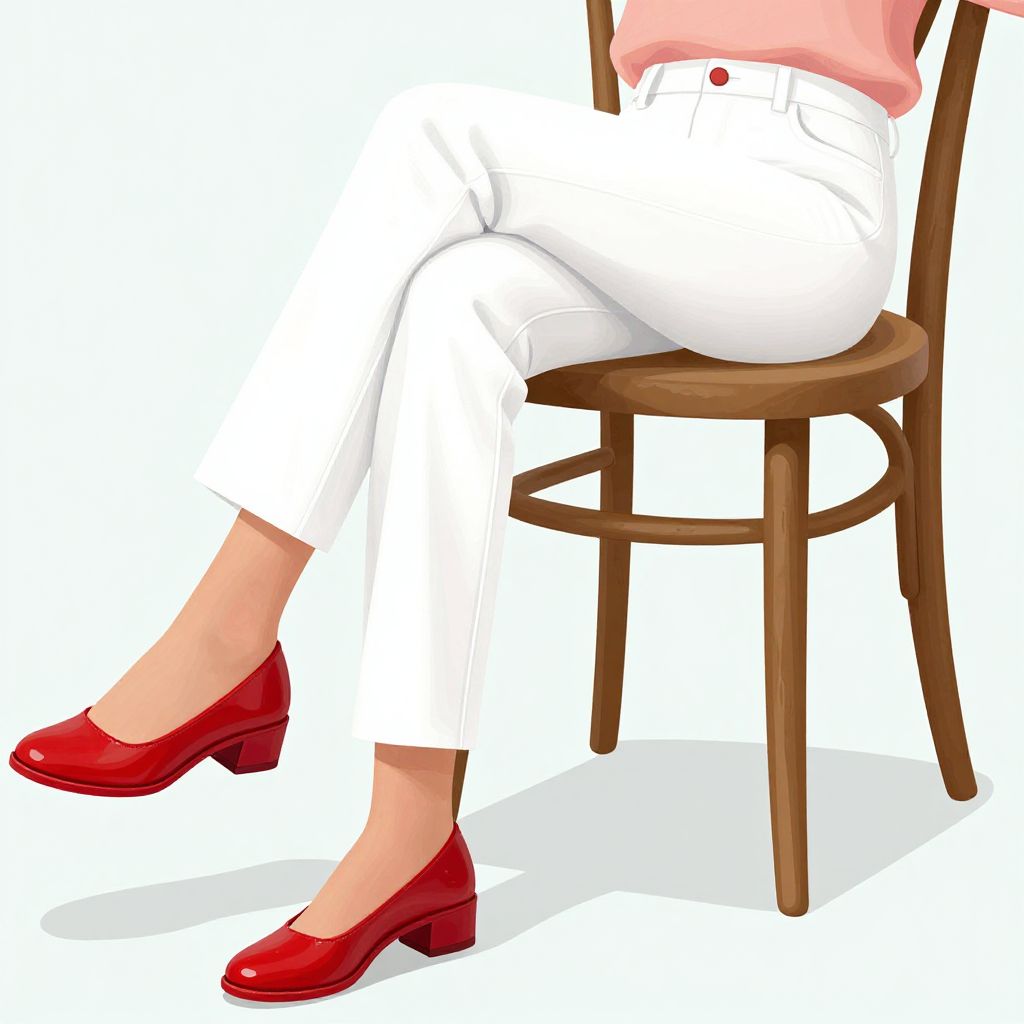 Digital illustration of a person sitting on a wooden chair against a solid black background. The subject's upper body is cropped out, focusing on their lower half. They wear white, slightly tapered pants that end just above the ankles, and bright red, pointed-toe high heels with a moderate heel height. The person also wears a red long-sleeve top. The chair has a simple, classic design with curved wooden legs. The overall style is flat and minimalistic with bold, contrasting colors.