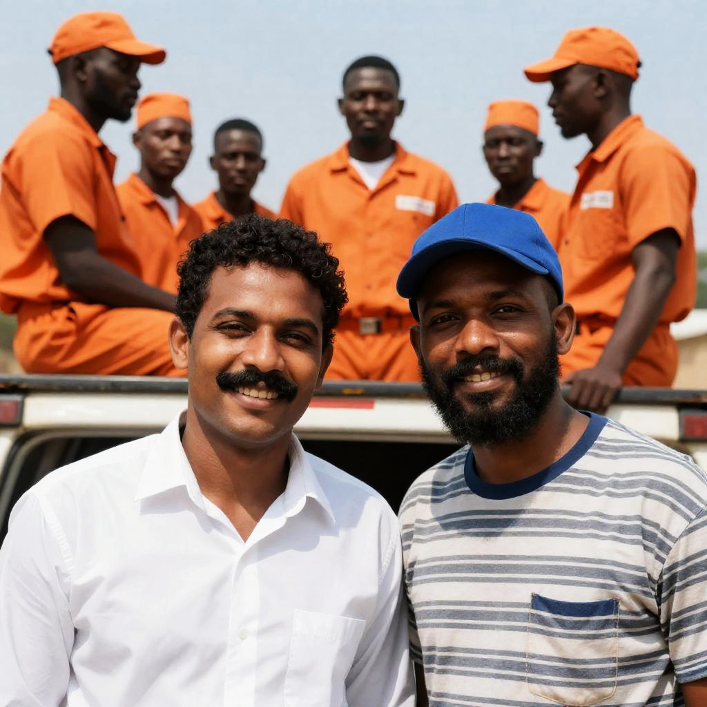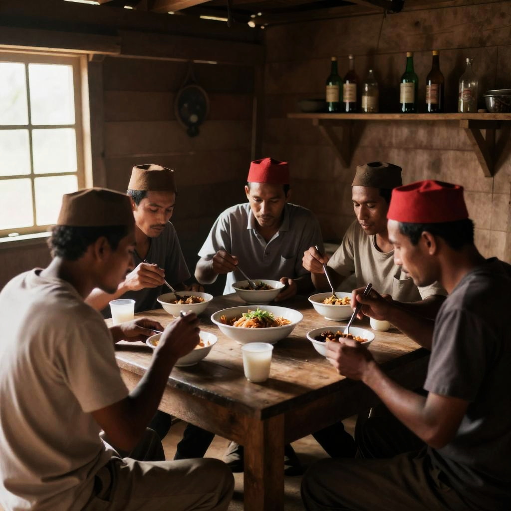 Group of 20 people, mostly men, standing and sitting around a large wooden barrel in a sunlit hillside clearing. Wearing beige and patterned shirts, khaki pants, and hats. Some raise arms, others talk, smile. Background shows rolling green hills, trees, and dry grass. Sunlight filters through leaves. People's faces show joy and engagement. Barrel centered, surrounded by people.