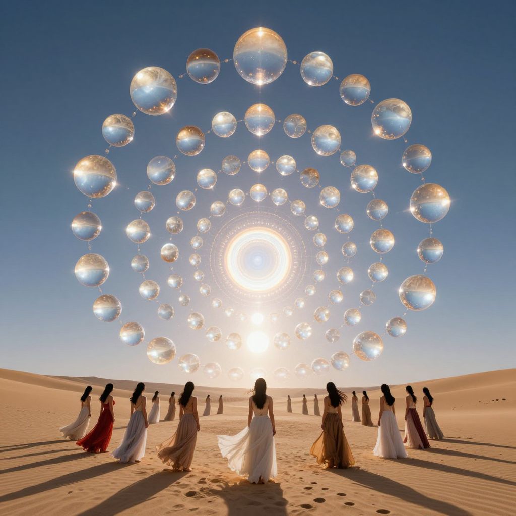 In a surreal desert expanse, a procession of women in flowing robes stands before a mesmerizing spiral of floating orbs, their reflections mirroring an infinite cosmos, evoking a profound sense of transcendence and the cyclical dance of life, death, and rebirth.