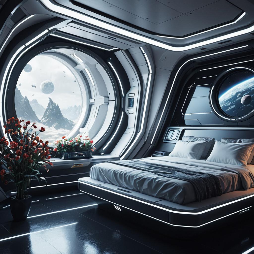 Modern and sleek bedroom interior inside a futuristic personal spaceship. Features a large circular window showcasing a distant space landscape with planets and moons. The room includes a neatly made bed with white bedding and pillows, ambient LED lighting integrated into the walls and floor, and decorative flowers adding a touch of nature to the high-tech setting. The design is inspired by luxury hotel aesthetics with sci-fi elements, emphasizing clean lines and volumetric cinematic lighting.